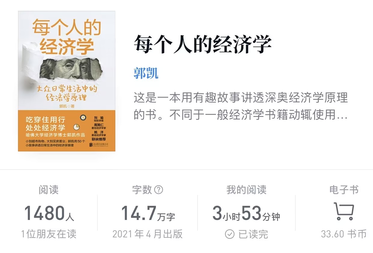 PS:这本书微信读书上叫《每个人的经济学》,是原书的再版,内容基本没变。喜欢电子书的朋友可以直接在微信读书上看。